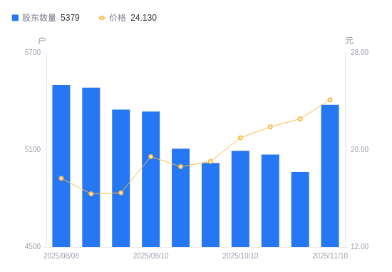 近一年(2024年11月20日至2025年11月10日),*ST和科A股股东户数从7195户,减低至5379户,降幅25.24%,区间股价上涨15.95%。