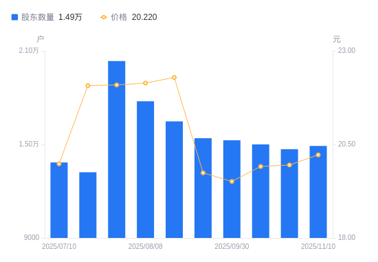 近一年(2024年11月20日至2025年11月10日),长青科技A股股东户数从1.52万户,减低至1.49万户,降幅2.04%,区间股价上涨23.16%。