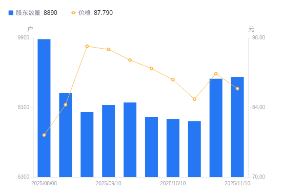 近一年(2024年11月20日至2025年11月10日),博实结A股股东户数从1.44万户,减低至8890户,降幅38.35%,区间股价上涨38.35%。