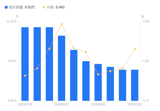 近一年(2024年12月1日至2025年11月10日),黑芝麻A股股东户数从16万户,减低至9.5万户,降幅40.62%,区间股价下跌19.20%。