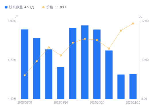 近一年(2024年11月20日至2025年11月10日),中原内配A股股东户数从5万户,减低至4.91万户,降幅1.74%,区间股价上涨92.86%。