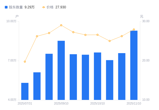 近一年(2024年11月20日至2025年11月10日),中欣氟材A股股东户数从2.49万户,增加至9.29万户,增幅272.57%,区间股价上涨145.22%。