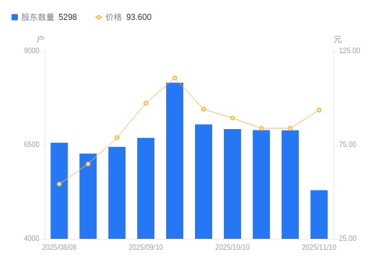 近一年(2024年11月20日至2025年11月10日),凯迪股份A股股东户数从7880户,减低至5298户,降幅32.77%,区间股价上涨177.05%。