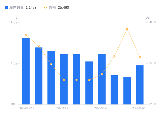 近一年(2024年11月20日至2025年11月10日),聚杰微纤A股股东户数从8860户,增加至1.14万户,增幅28.49%,区间股价上涨87.34%。