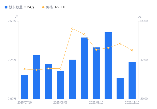 近一年(2024年11月20日至2025年11月10日),奥海科技A股股东户数从2.84万户,减低至2.24万户,降幅21.32%,区间股价上涨30.86%。