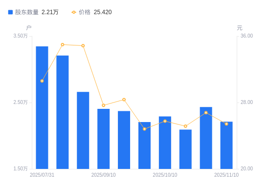 近一年(2024年12月10日至2025年11月10日),深水规院A股股东户数从1.04万户,增加至2.21万户,增幅112.52%,区间股价上涨56.33%。