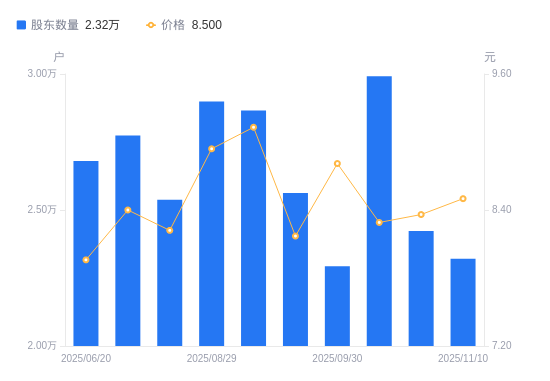 近一年(2024年11月20日至2025年11月10日),冀凯股份A股股东户数从1.57万户,增加至2.32万户,增幅47.78%,区间股价上涨48.08%。