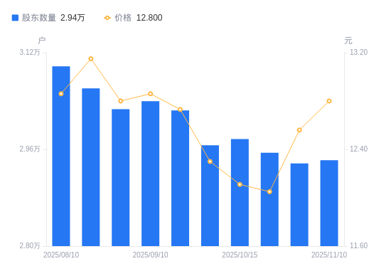近一年(2024年11月20日至2025年11月10日),中成股份A股股东户数从3.5万户,减低至2.94万户,降幅15.98%,区间股价下跌18.42%。