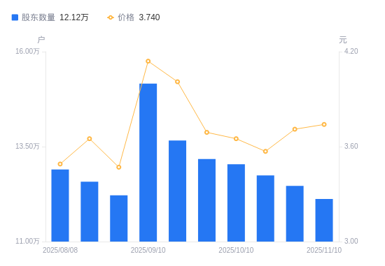 近一年(2024年11月20日至2025年11月10日),大东南A股股东户数从6.47万户,增加至12.12万户,增幅87.22%,区间股价上涨45.53%。