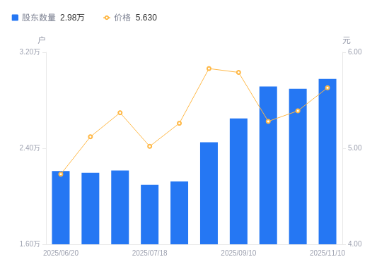 近一年(2024年11月20日至2025年11月10日),亚联发展A股股东户数从2.64万户,增加至2.98万户,增幅12.68%,区间股价上涨80.45%。