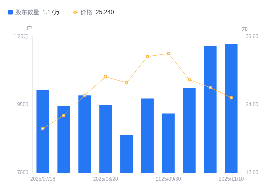 近一年(2024年12月20日至2025年11月10日),福立旺A股股东户数从7465户,增加至1.17万户,增幅57.24%,区间股价上涨68.38%。