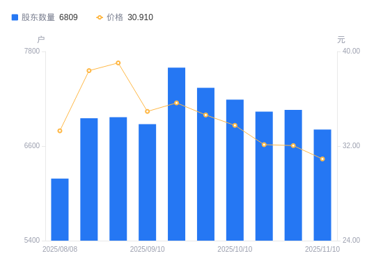 近一年(2024年11月20日至2025年11月10日),金橙子A股股东户数从4813户,增加至6809户,增幅41.47%,区间股价上涨53.13%。