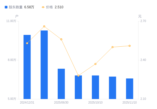 近一年(2024年12月31日至2025年11月10日),*ST四环A股股东户数从9.94万户,减低至6.58万户,降幅33.78%,区间股价下跌3.83%。