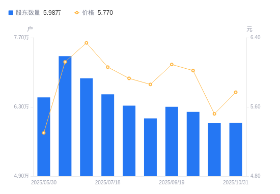近一年(2024年11月29日至2025年11月10日),福能东方A股股东户数从8.96万户,减低至6.03万户,降幅32.71%,区间股价下跌32.09%。
