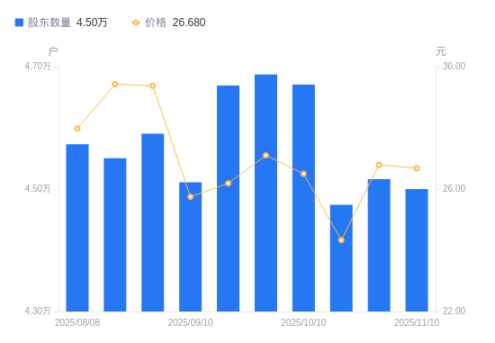 近一年(2024年11月20日至2025年11月10日),彩讯股份A股股东户数从4.63万户,减低至4.5万户,降幅2.81%,区间股价上涨26.87%。