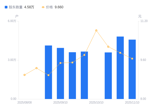 近一年(2025年8月29日至2025年11月10日),深赛格A股股东户数从4.13万户,增加至4.58万户,增幅10.93%,区间股价上涨7.10%。
