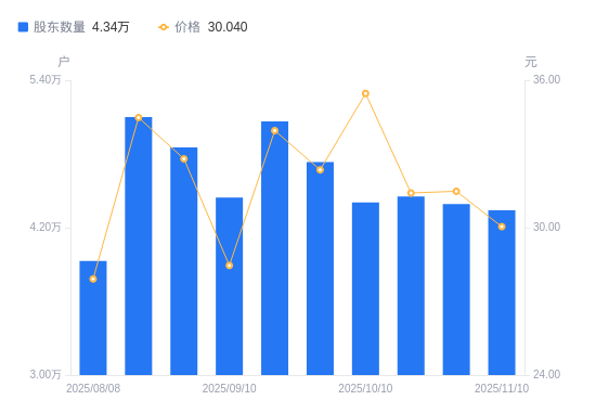 近一年(2024年11月20日至2025年11月10日),飞荣达A股股东户数从3.81万户,增加至4.34万户,增幅14.08%,区间股价上涨53.02%。