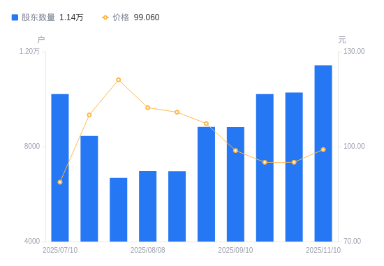 近一年(2024年12月31日至2025年11月10日),托普云农A股股东户数从1.56万户,减低至1.14万户,降幅26.68%,区间股价上涨11.29%。