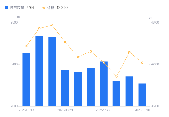 近一年(2024年11月20日至2025年11月10日),丰茂股份A股股东户数从6617户,增加至7766户,增幅17.36%,区间股价上涨35.75%。