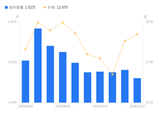 近一年(2024年12月31日至2025年11月10日),北鼎股份A股股东户数从1.71万户,减低至1.52万户,降幅11.16%,区间股价上涨28.88%。