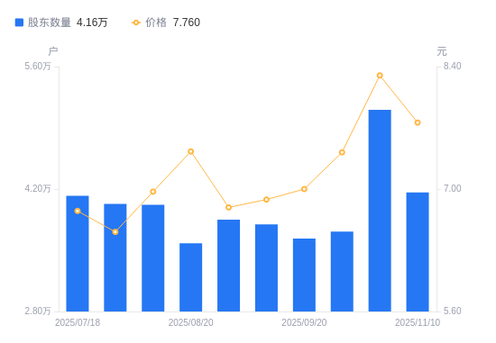 近一年(2024年12月20日至2025年11月10日),东贝集团A股股东户数从2.63万户,增加至4.16万户,增幅58.24%,区间股价上涨52.76%。