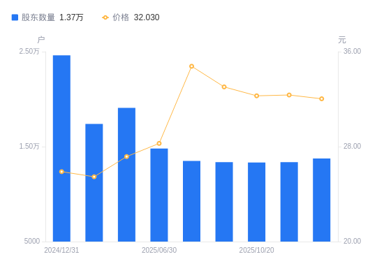 11月17日消息,数据显示,截至2025年11月10日,小方制药A股股东总户数为1.37万户,较上期(2025年10月31日)增加385户,增幅2.88%。公司最新A股总股本为1.61亿股,其中流通A股5440万股,户均持有流通A股数量为3956.65股,较上期减少113.99股,降幅2.80%;户均持流通A股市值12.67万元,较上期减少4953.58元,降幅3.76%。