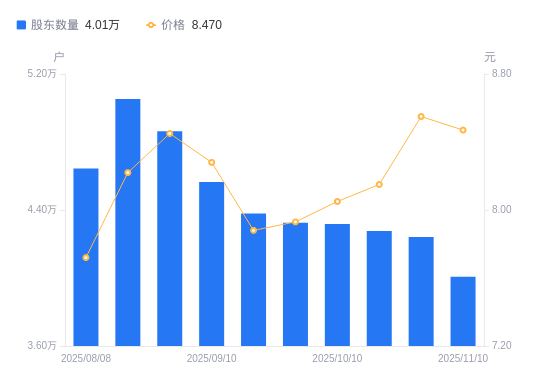 近一年(2024年12月31日至2025年11月10日),九鼎新材A股股东户数从3.57万户,增加至4.01万户,增幅12.24%,区间股价上涨60.23%。