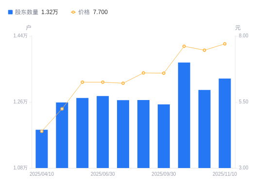 近一年(2024年12月20日至2025年11月10日),ST八菱A股股东户数从1.34万户,减低至1.32万户,降幅0.91%,区间股价上涨58.11%。