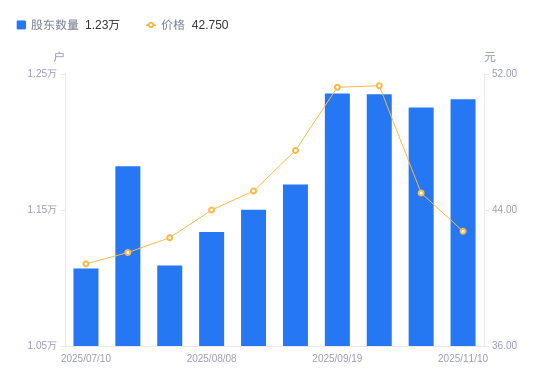 近一年(2024年11月20日至2025年11月10日),金杨股份A股股东户数从1.23万户,减低至1.23万户,降幅0.12%,区间股价上涨74.16%。