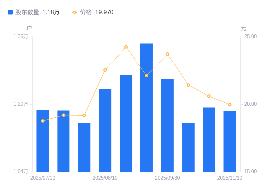 近一年(2024年11月20日至2025年11月10日),铭利达A股股东户数从1.07万户,增加至1.18万户,增幅11.07%,区间股价上涨3.26%。