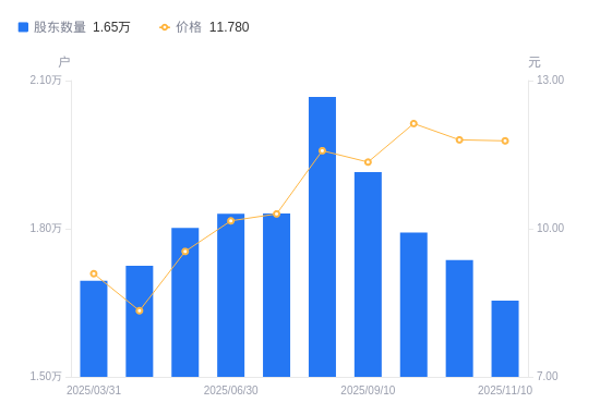 近一年(2024年11月29日至2025年11月10日),华新环保A股股东户数从1.91万户,减低至1.65万户,降幅13.19%,区间股价上涨22.58%。