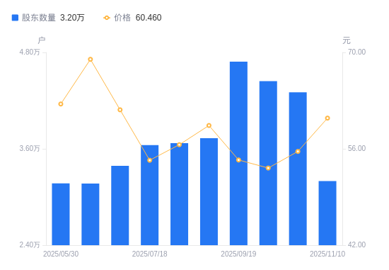 近一年(2024年11月20日至2025年11月10日),中宠股份A股股东户数从2.4万户,增加至3.2万户,增幅33.42%,区间股价上涨85.35%。