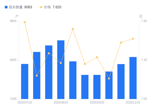 近一年(2024年11月20日至2025年11月10日),*ST交投A股股东户数从7200户,增加至8063户,增幅11.99%,区间股价上涨23.50%。
