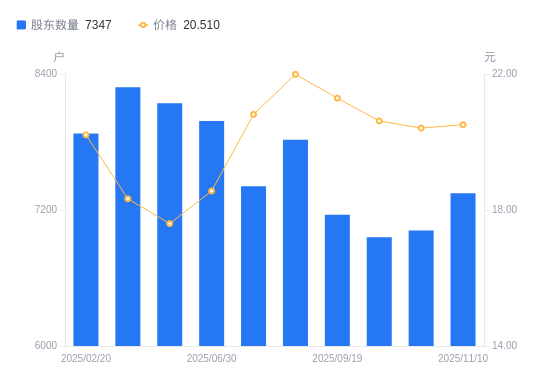 近一年(2024年12月10日至2025年11月10日),美新科技A股股东户数从8724户,减低至7347户,降幅15.78%,区间股价下跌9.77%。