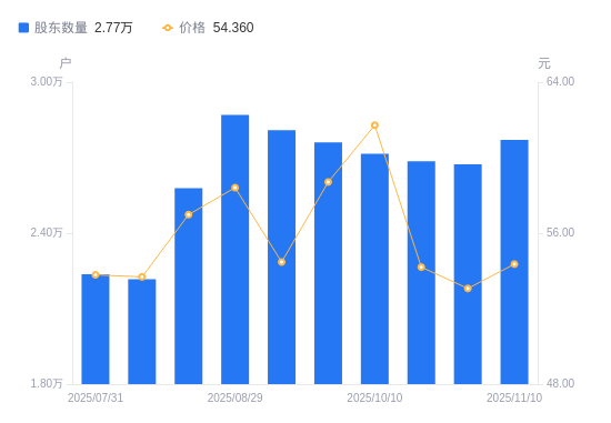 近一年(2024年11月20日至2025年11月10日),珂玛科技A股股东户数从3.22万户,减低至2.77万户,降幅13.93%,区间股价下跌12.42%。