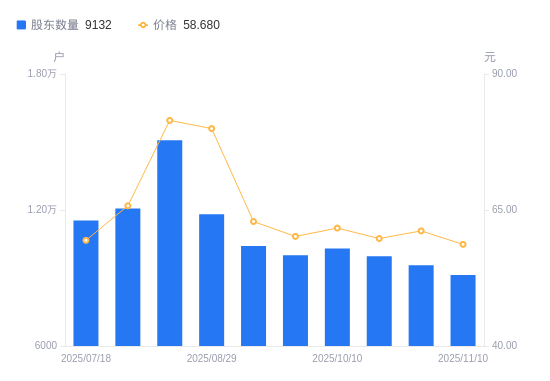 近一年(2024年11月29日至2025年11月10日),恒宇信通A股股东户数从5988户,增加至9132户,增幅52.51%,区间股价上涨83.32%。