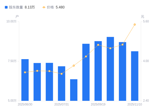 近一年(2024年12月20日至2025年11月10日),康盛股份A股股东户数从4.95万户,增加至8.13万户,增幅64.05%,区间股价上涨79.08%。