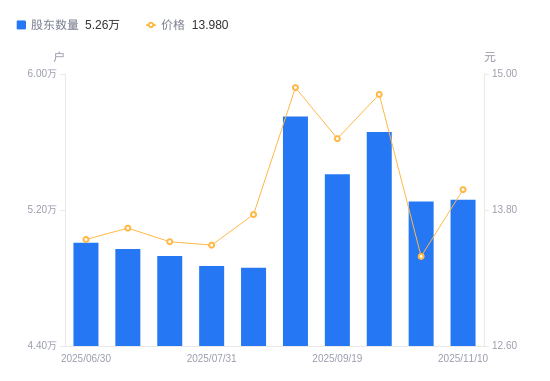 近一年(2024年11月20日至2025年11月10日),安洁科技A股股东户数从5.01万户,增加至5.26万户,增幅4.99%,区间股价下跌12.19%。