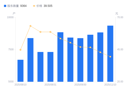近一年(2024年12月31日至2025年11月10日),奇德新材A股股东户数从7666户,增加至9364户,增幅22.15%,区间股价上涨146.52%。