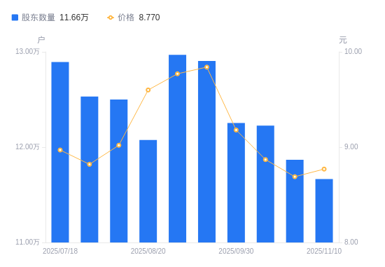 近一年(2024年11月8日至2025年10月31日),卓翼科技A股股东户数从10.23万户,增加至11.87万户,增幅15.99%,区间股价上涨24.14%。