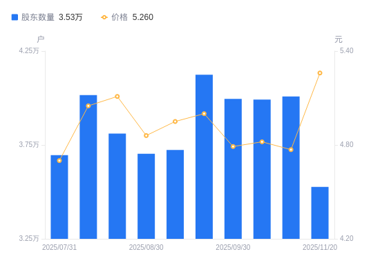 近一年(2024年11月20日至2025年11月20日),得利斯A股股东户数从4.2万户,减低至3.53万户,降幅15.97%,区间股价上涨17.94%。