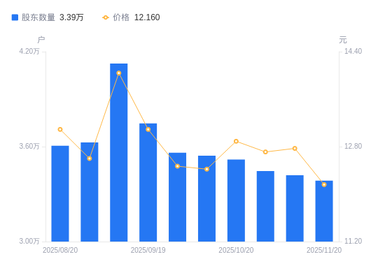 近一年(2024年11月20日至2025年11月20日),煌上煌A股股东户数从3.86万户,减低至3.39万户,降幅12.32%,区间股价上涨57.92%。