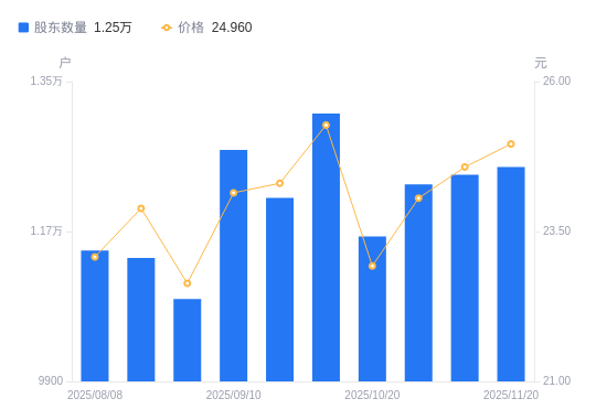 近一年(2024年11月20日至2025年11月20日),中瑞股份A股股东户数从1.28万户,减低至1.25万户,降幅2.39%,区间股价下跌7.02%。