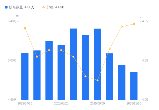近一年(2024年11月20日至2025年11月20日),张家港行A股股东户数从5.4万户,减低至4.88万户,降幅9.64%,区间股价上涨8.94%。