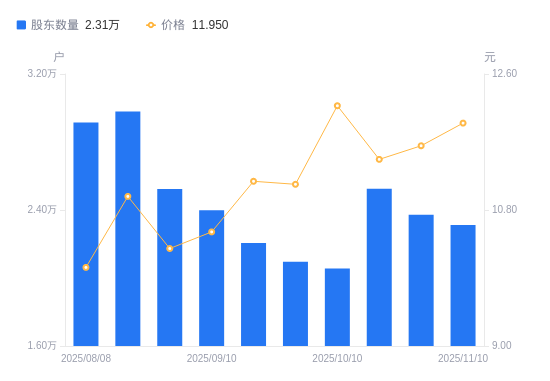 11月21日消息,数据显示,截至2025年11月20日,联发股份A股股东总户数为2.6万户,较上期(2025年11月10日)增加2861户,增幅12.38%。公司最新A股总股本为3.24亿股,其中流通A股3.23亿股,户均持有流通A股数量为1.24万股,较上期减少1540.16股,降幅11.01%;户均持流通A股市值17.17万元,较上期增加4617.53元,增幅2.76%。