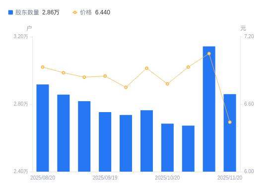 近一年(2024年11月20日至2025年11月20日),新筑股份A股股东户数从3.11万户,减低至2.86万户,降幅8.15%,区间股价上涨36.15%。