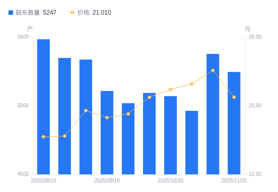 近一年(2024年11月20日至2025年11月20日),*ST和科A股股东户数从7195户,减低至5247户,降幅27.07%,区间股价上涨0.96%。