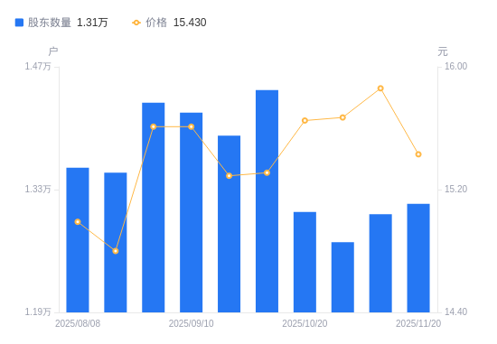 近一年(2024年11月20日至2025年11月20日),地铁设计A股股东户数从1.38万户,减低至1.31万户,降幅4.89%,区间股价上涨3.63%。