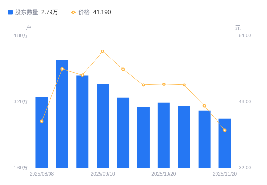 近一年(2024年11月20日至2025年11月20日),新瀚新材A股股东户数从1.17万户,增加至2.79万户,增幅138.46%,区间股价上涨166.67%。