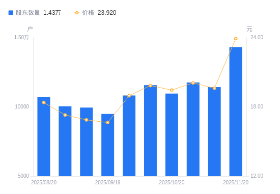 近一年(2024年11月20日至2025年11月20日),宁波色母A股股东户数从8196户,增加至1.43万户,增幅74.77%,区间股价上涨62.71%。